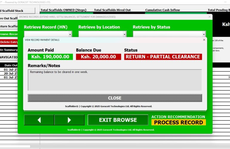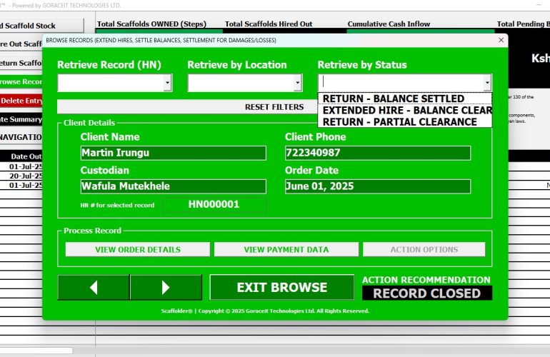 Extend scaffold hires seamlessly with tracked payments, original hire link, and history.