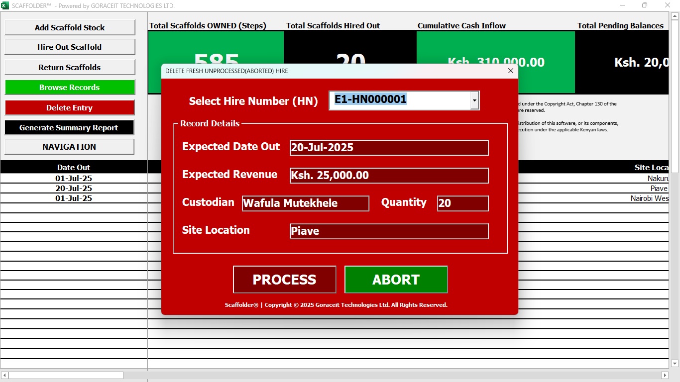 When a record is deleted, Scaffolder instantly updates related data points across the system — including scaffold availability, order summaries, and hire logs. This automatic cleanup maintains accuracy and prevents lingering data from affecting future operations or reporting.
