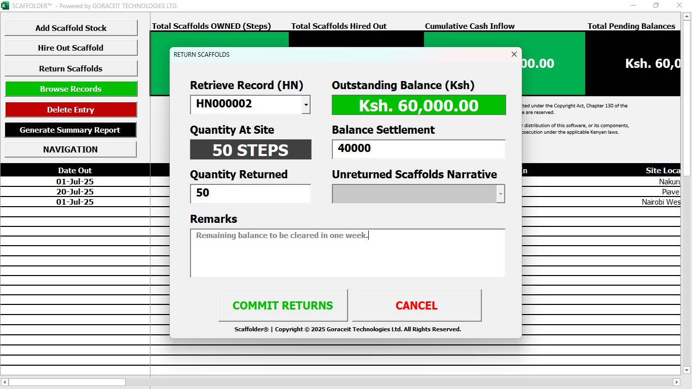 The Return Scaffolds form only activates if there are pending hires with scaffolds yet to be returned. If all scaffolds are already back or no valid hires exist, the user is notified and the form stays inactive—eliminating redundancy and ensuring accurate record management.