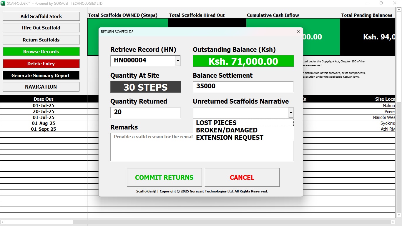 Users can specify reasons for unreturned scaffolds and include custom remarks to explain unique return scenarios. This adds transparency to incomplete or problematic returns, helping management assess losses, client responsibility, or trends needing attention.