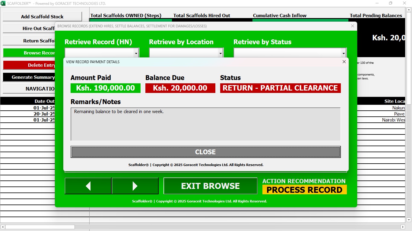 More than just numbers, the form also displays the current record status—whether scaffolds are still on-site, returned, or partially cleared—giving full context to the payment data. This allows users to align financials with operational realities for accurate evaluations.